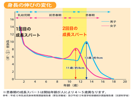 男子は13歳前後、女子は11歳前後に訪れる成長スパートをきっかけに、20歳までの間にコツコツと伸びる環境と栄養を意識することが大切で、とくにアスリートを目指す子供はこの時期はとても大切になります。