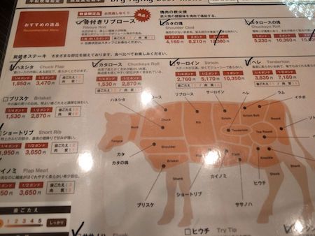 お肉好きの方は夜のメニューがオススメです!オーダーは熟成されたお肉の部分にチェックされていてそこから好みのお肉を1/2〜1ポンドで注文して行きます。数人で何種類かのお肉を頼んで食べ比べるのもオススメです。