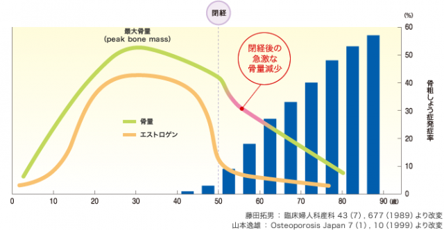 とくにホルモンが減少する更年期には注意が必要になり、女性は閉経後に急に骨量が低下し骨がスカスカになる骨粗鬆症のリスクが高くなり、50歳以上の女性では24%、70歳以上では50%が骨粗鬆症担っているといわれています。