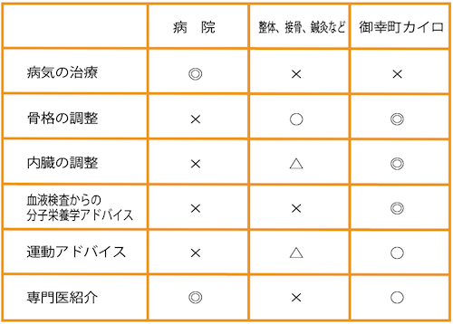 御幸町カイロプラクティックでは、骨格、内臓の位置や働き、自律神経などの専門的な調整とそして、整体やカイロ、整骨、鍼灸などでは出来ない提携医療機関の医師監修のもと血液検査から栄養状態をチェックし栄養療法で身体の外と内から両方での体調改善ができます。