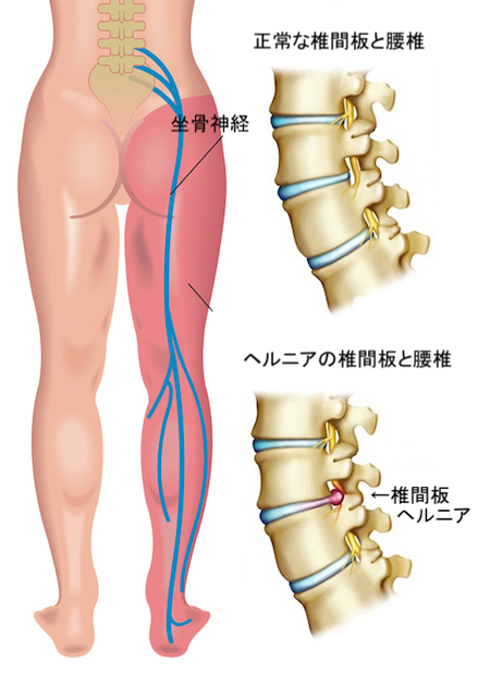 椎間板ヘルニアの場合は簡単にいえば腰痛が原因で足に痛みやしびれを伴い、坐骨神経痛の場合は腰の痛みは感じないor少ないことが多くお尻の奥から足にかけての痛みやしびれを感じることが多いです。