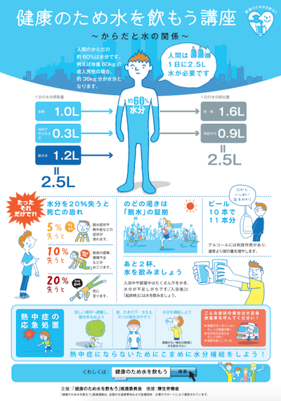 臓器では、脳の約80%、血液の約90%は水分になり血液やリンパ液に含まれる水分は体内を巡回し、栄養や酸素を細胞に運び、疲労物質や老廃物を回収するという大切な働きをしています。また、汗をかくことによって体温を調節する働きもあるので、暑い季節を健康に過ごすためにも正しい水分補給の知識が大切です。