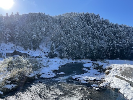 丁度、週末の寒波で雪が降り日曜日は晴れというなかなか無い絶好のコンディションでした。ウッディー京北からバスでスタート地点のおーらい黒田屋へ移動してスタートです。