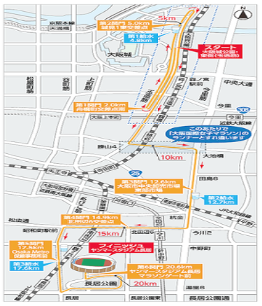 ハーフマラソンは大阪城公園からスタートしてヤンマースタジアム長居がゴールになります。