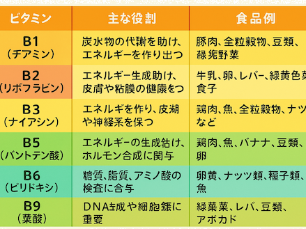 ビタミンB群はエネルギーを作るために欠かせない栄養素で、8種類が互いに協力して働きます