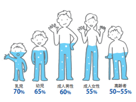 人の体は成人では体重の約60%、新生児で約80%、高齢者では50%程度が水分です。
