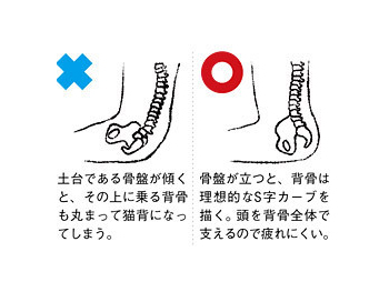 両腕でバランスをとれるため楽に思える姿勢ですが、背中が丸まり骨盤がゆがみやすいなど、やはりおすすめできません。背中全体のアーチが崩れ、骨盤も後傾で開いた状態になり、首、肩、背中、腰の痛みの原因になります。