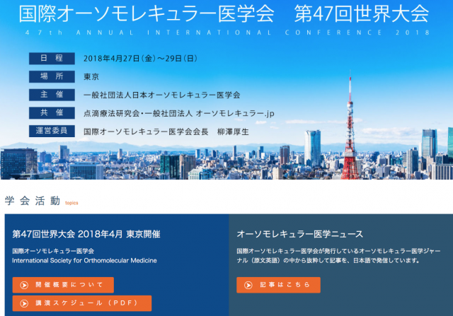 今年は4/27〜4/29セルリアンタワー東急ホテルで日本で初開催です。世界中からオーソモレキュラー(分子整合栄養医学)の著名な医師や専門家が集まり最新の栄養療法の情報をきくことができ日本からも栄養療法の第一線で活躍する先生の講演もあります。
