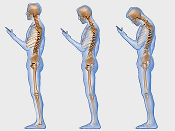 うつむく角度がきつくなると比例して首への負担は大きくなり、うつむきが0度で約5kg、15度で13 Kg、45度で22kgと負担が大きくなります。これを1ケ月、半年、1年、10年と負担をかけ続けた結果がストレートネックになってきます。