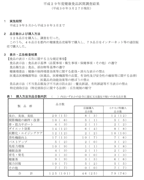 東京都健康安全研究センターでは健康食品やサプリメントの調査結果が報告され125品目をお店やネットで購入し、食品表示や衛生、医薬品医療機器法など6つの法律に違反していないかを検査した結果125品目中101品目に法令に違反や違反の疑いがあるという結果があるということでした。