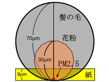 例えば杉花粉は約30μmなので鼻腔や咽頭まで届くので目・鼻・喉に症状が出やすく、黄砂は約10μmなので気管・気管支で症状を引き起こし、PM2.5は2.5μmなので一番キメの細かい肺の奥にまで入り症状を起こします。