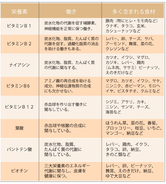 ビタミンB群の栄養素は、ビタミンB1、ビタミンB2、ビタミンB6、ナイアシンパントテン酸、ビオチン、ビタミンB12葉酸などがあります。
