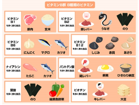 ビタミンの中で「ビタミンB群」に分類されるものは、ビタミンB1、ビタミンB2、ビタミンB6、ビタミンB12、ナイアシン、葉酸、パントテン酸、ビオチンの8種類になります。 ビタミンB群の多くは、体内で酵素やホルモンの補酵素として、酵素タンパク質とともに働きます。