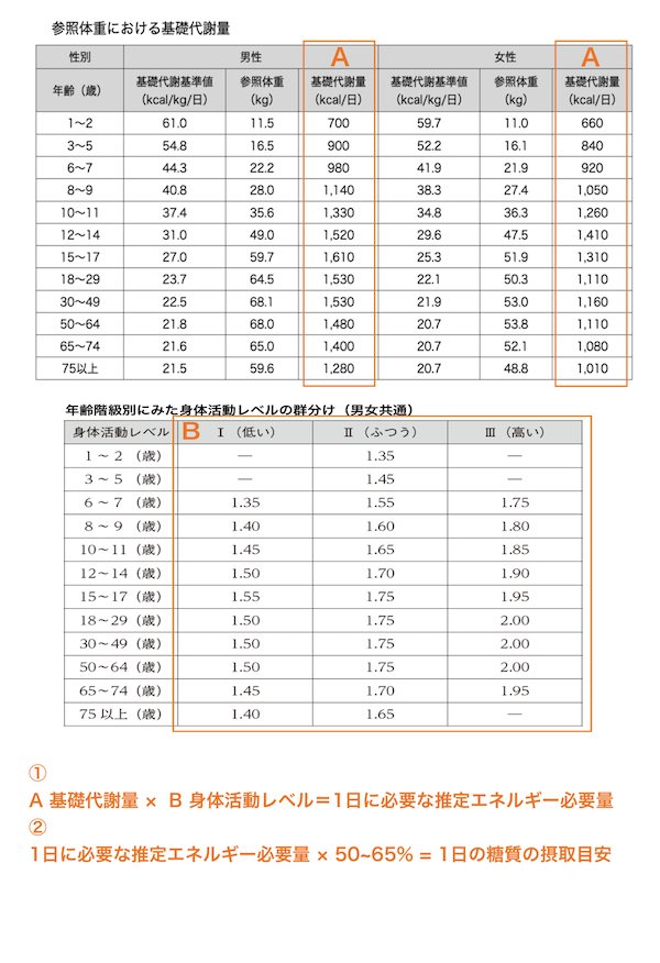 基礎代謝×身体活動レベル=1日のエネルギー必要量の50〜65%が目安です。