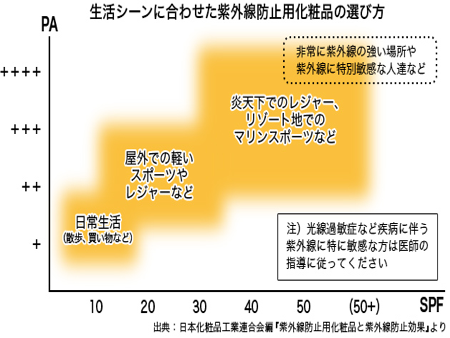 PAは、UVAという皮膚の黒化と肌の弾力を失わせる紫外線A波を防ぐ目安を表し[+]の数が多くなると、UVAに対する防御が高いことを表します。