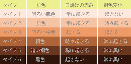 フィッツパトリックのスキンタイプは6タイプに分類されタイプ1が皮膚のダメージが高く、タイプ6が皮膚のダメージが低いという見方になります。