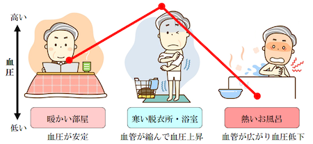 これは、ヒートショックといわれる大きな温度変化で血圧が上下に急激に変動することが原因で起こります。脱衣所や浴室では、室温が10度以下になることが多く脱衣所で服を脱ぐと、急激に体の表面の温度が下がり寒冷刺激で血圧が急上昇し、心筋梗塞や脳梗塞を起こしてしまいます。