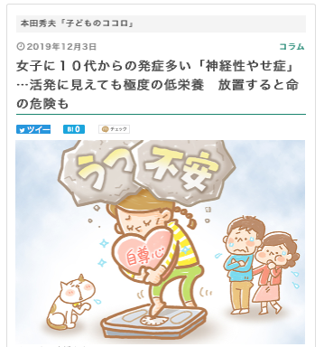 先日、えいご皮膚科の先生から「女子に10代からの発症の多い神経性やせ症」の記事を送っていただきました。神経性やせ症はあるきっかけで食事ができなくなり、低栄養が続き低体重を起こし、貧血やイライラもきつく気持ちや体調が不安定になってしまう症状です。